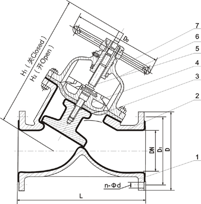 | 产品特点 设计与制造:GB122239 结构长度:GB12221、JB1688 法兰连接尺寸:GB4216、JB78 G45J直流式衬胶隔膜阀,直流式隔膜阀,衬胶隔膜阀 产品用途 本阀专用于控制非腐蚀性或一般腐蚀性介质,阀体内腔表面无衬里或覆有可供选择的各种橡胶,适用于不同工作温度和流体管路。 适用温度:≤85℃、≤100℃、 ≤120℃(按照衬里和隔膜材料) 压力等级:PN0.6、1.0、1.6 产品材料阀体:铸铁、球墨铸铁、碳钢、不锈钢阀盖:铸铁、球墨铸铁、碳钢、不锈钢 衬里:无衬里、橡胶 隔膜:橡胶 阀瓣:铸铁、碳钢 阀杆:碳钢、不锈钢手轮:铸铁 产品测试衬里层:电火花检测试验与检验按GB/T13297标准 公称压力:PN(Mpa) 阀体:PN×1.5 密封:PN×1.1 结构特点隔膜阀是一种特殊形式的截止阀;1、弹性密封的开闭件,确保没有内漏; 2、流线型的流道,使得压力损失小; 3、没有填料函,因此没有外漏; 4、阀体与盖被中间隔膜隔开,使得隔膜上方的阀盖,阀杆零件不受介质侵蚀; 5、隔膜可更换,维护费用低; 6、衬里材料的多样性,可适用于各种介质,并具有良好的耐腐蚀性。 衬胶直流式隔膜阀主要尺寸及重量