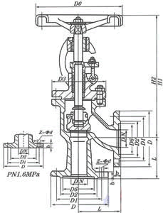 性能参数 设计与制造符合中国国家标准 1、基本结构形式:角式 2、公称压力:PN1.6-4.0(MPa) 3、公称通径:DN15-300(mm) 应用规范 遵循规范 STANDARD 设计与制造 GB12233/GB 12235 结构长度 GB 12221/JB96(长系列) 结构长度 GB78/JB79(GB、HG、SH) 压力试验 GB/T 13927 标志 GB 12220 供货 GB/T12252 1.6MPa主要连接尺寸 DN in L D D1 D2 f b z-φd Do H1 H2 W 15 1/2 65/90 95 65 45 2 14 4-φ14 100 240 265 7 20 3/4 75/95 105 75 55 2 16 4-φ14 100 245 270 7.5 25 1 80/100 115 85 65 2 16 4-φ14 120 250 275 8.5 32 21/4 95/105 135 100 78 2 18 4-φ18 140 260 290 12 40 21/2 100/115 145 110 85 2 18 4-φ18 140 290 325 14 50 2 115/125 160 125 100 2 20 4-φ18 160 300 335 19 65 21/2 145 180 145 120 2 20 4-φ18 180 355 400 27 80 3 155 195 160 135 2 22 4-φ18 240 400 450 42 100 4 175 215 180 155 2 24 8-φ18 240 455 495 50 125 5 200 245 210 185 2 26 8-φ18 280 530 560 64 150 6 240/225 280 240 210 2 28 8-φ23 320 605 650 85 200 8 275 335 295 265 2 30 8-φ23 360 650 770 155 2.5MPa主要连接尺寸 DN in L D D1 D2 f b z-φd Do H1 H2 W 15 1/2 65/90 95 65 45 2 16 4-φ14 120 245 270 7.5 20 3/4 75/95 105 75 55 2 16 4-φ14 120 250 275 8.8 25 1 80/100 115 85 65 2 16 4-φ14 140 260 290 11 32 21/4 95/105 135 100 78 2 18 4-φ18 140 290 325 13 40 21/2 100/115 145 110 85 3 18 4-φ18 160 300 335 18 50 2 115/125 160 125 100 3 20 4-φ18 180 355 400 31 65 21/2 145 180 145 120 3 22 8-φ18 220 400 450 39 80 3 155 195 160 135 3 22 8-φ18 280 450 495 50 100 4 175 230 190 160 3 24 8-φ23 320 530 590 60 125 5 200 270 220 188 3 28 8-φ25 380 600 650 75 150 6 240/225 300 250 218 3 30 8-φ25 400 650 770 98 200 8 275 360 310 278 3 34 12-φ23 450 700 850 170 产品尺寸