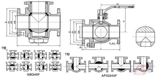 三通球阀介质流向原理 三通球阀分L型和T型,介质流通方向见下图。L型三通球阀适用于介质流向的切换,能使相互垂直的两个通道连通:T型三通球阀适用于介质的分流、合流或流向切换,T型孔道可以使三个通道互相连通或使其中两个通道连通,三通球阀一般采用两个阀座结构,亦可根据用户要求采用四阀座结构。