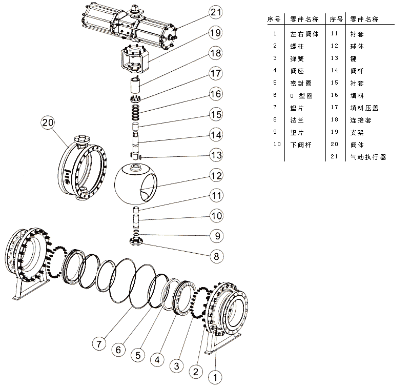 用途及用途 Q647型气动固定式球阀是新一代高性能球阀,适用于长输管线和一般工业管线,其强度、安全性、耐恶劣环境性等在设计时进行了特殊考虑,适用于各种腐蚀性和非腐蚀性介质。它与浮动球阀相比,工作时,阀前流体压力在球体上产生的作用力全部传递给轴承,不会使球体向阀座移动,因而阀座变形小,密封性能稳定、使用寿命长,适用于高压、大口径场合。先进的弹簧预阀座组件,具有自紧特性,实现上游密封。每阀有两个阀座,每个方向都能密封因而安装没有流向限制,是双向。本阀有二块式和三块式两种阀体结构,中法兰用螺栓连接,密封采用增强聚四氟乙烯镶入不锈钢圈内,钢圈后部设有弹簧保证阀座紧贴球体,保持密封。上下阀杆均设有PTFE轴承,减少磨擦,操作省力,小轴底部没有调整片,保证球与密封圈的接处位置。采用全通径的结构使阀门流量孔么与管线内径一致,以便管线清扫。